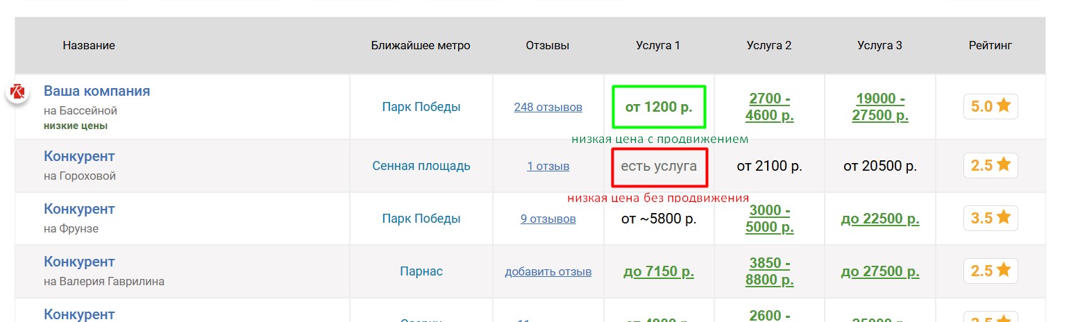 ателье, продвигаемое ателье попадёт к ним в таблицу «Сравнение по ценам», которая выглядит следующим образом: